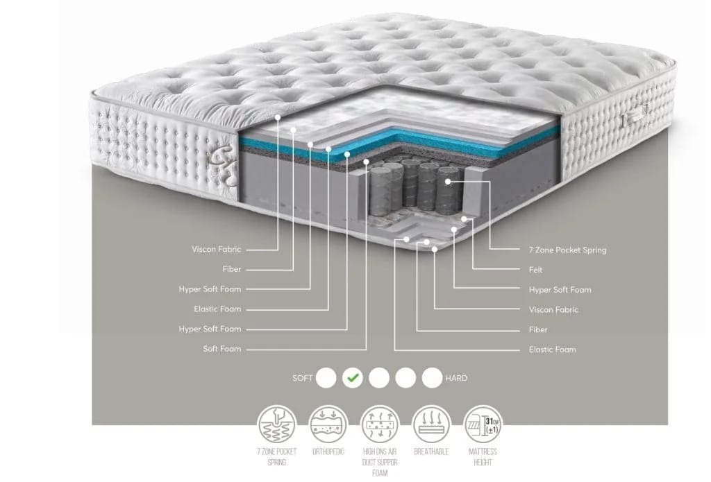 32cm Height7 Zone Pocket Spring TechnologyBreathableKnitted FabricLatex LayerOrthopaedic These Mattresses will all come rolled up in a box on delivery. Read more