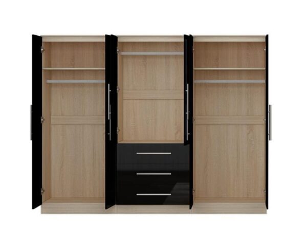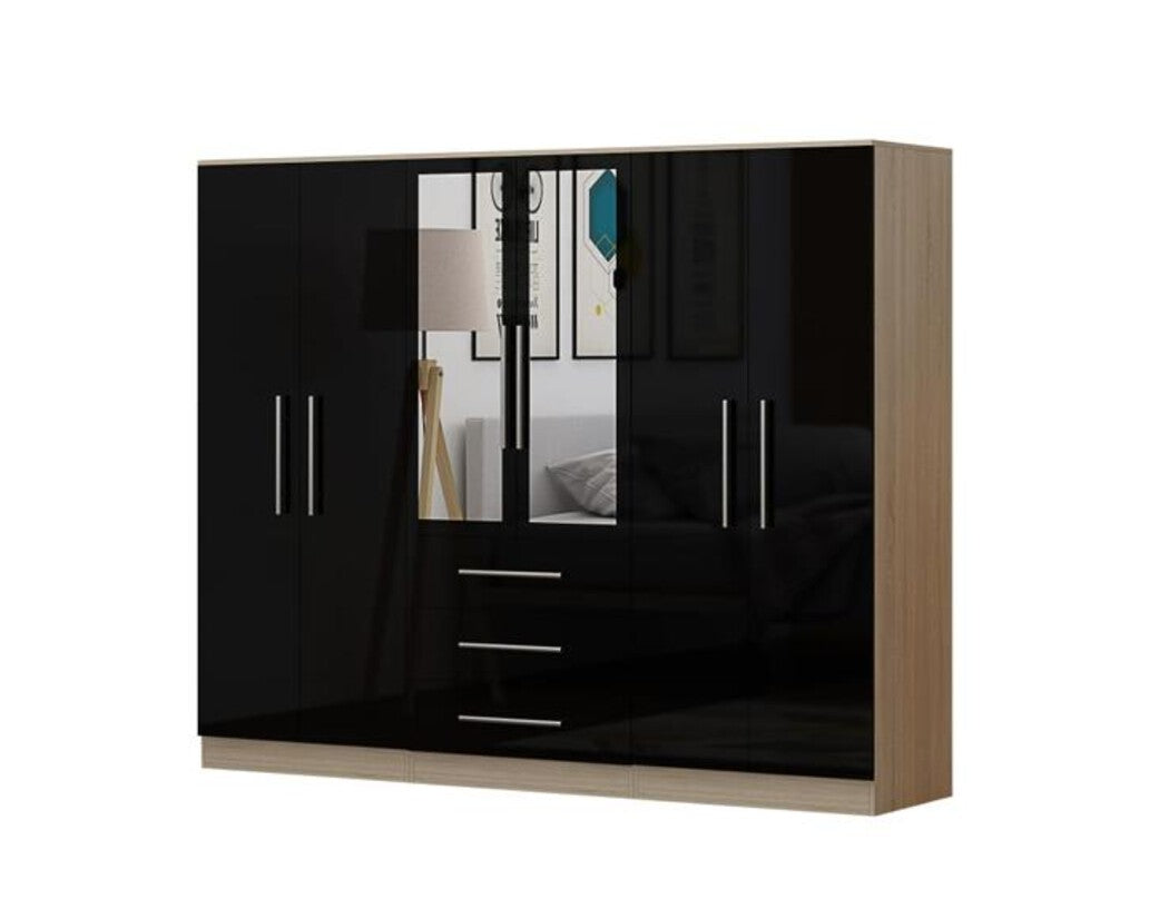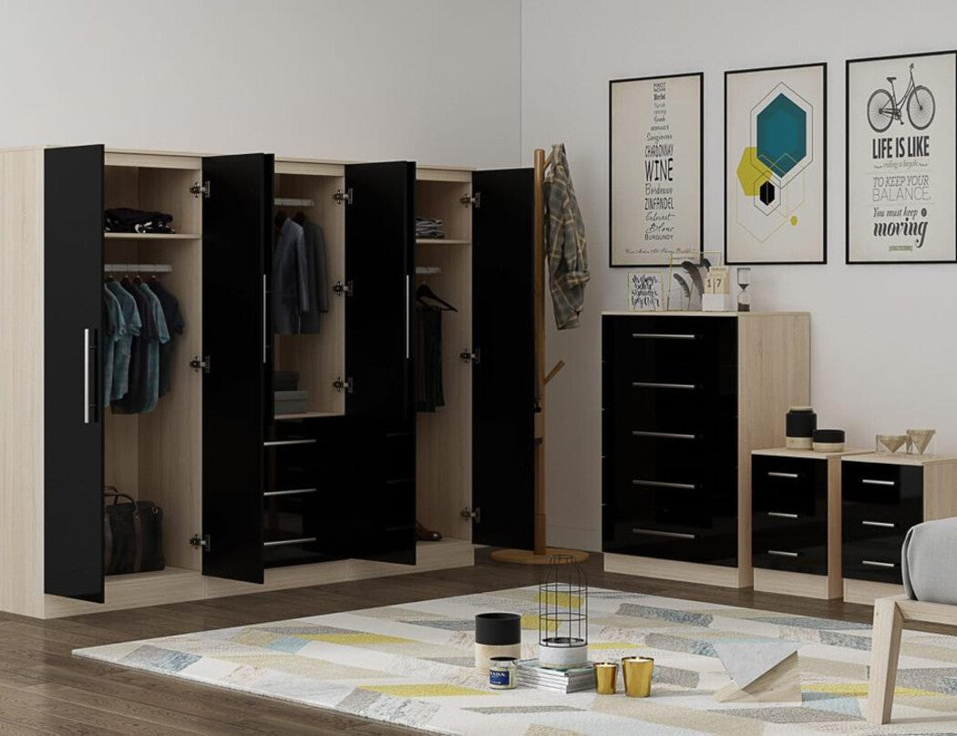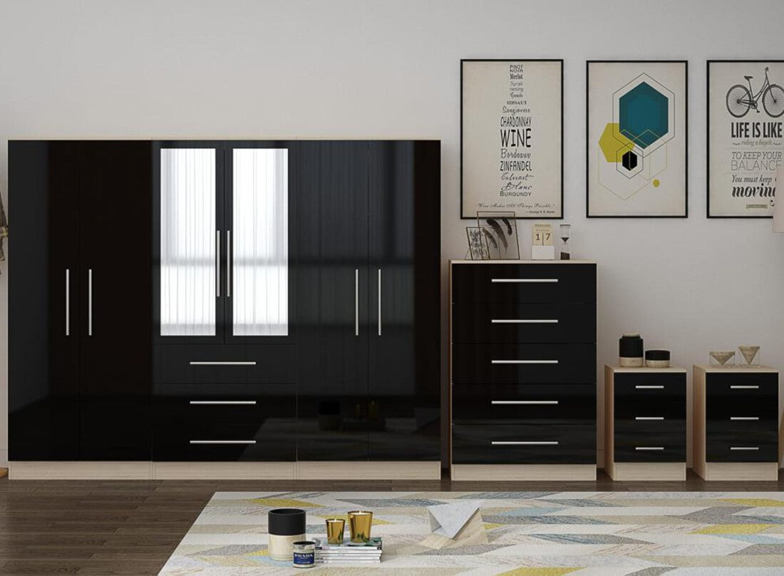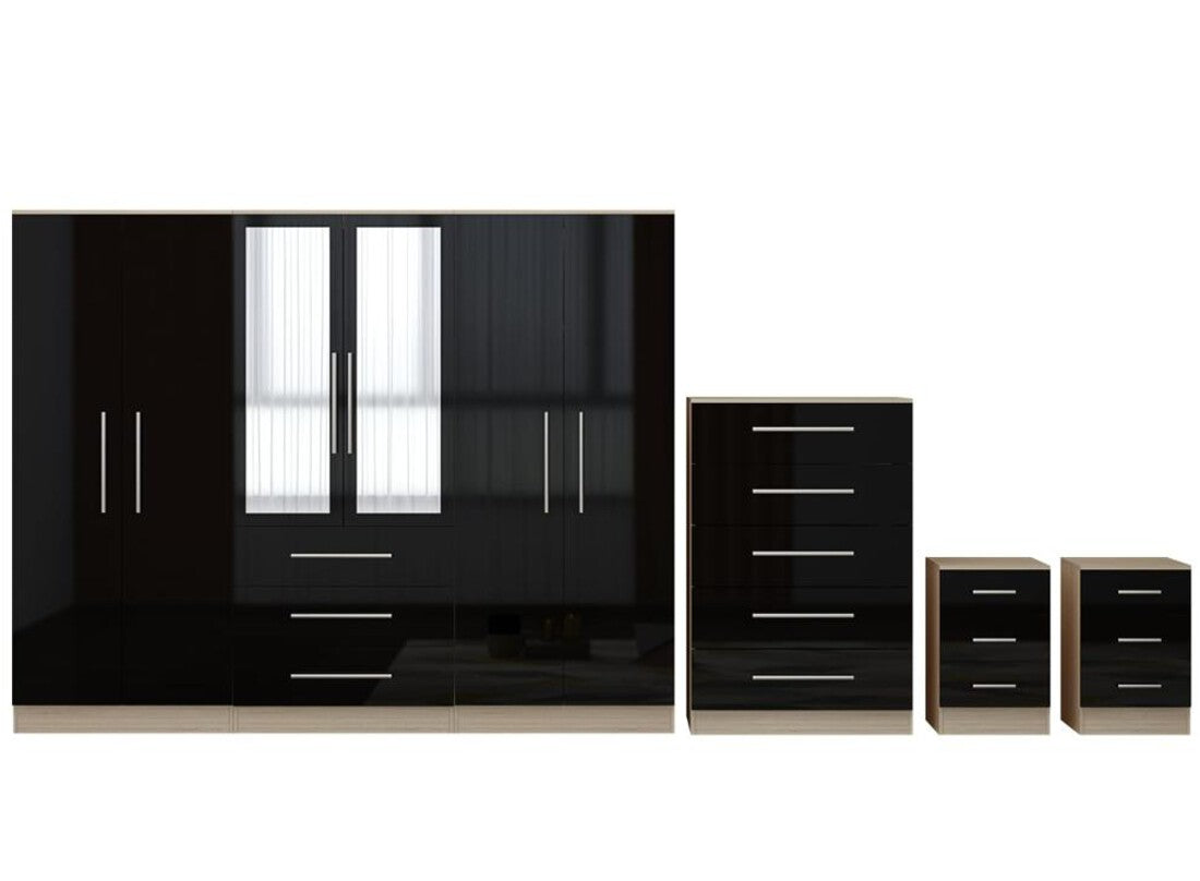High Gloss Black Large Wardrobe – 6 Door 3 Drawers & Long Mirror + Chest Of Drawers + 2 x Bedsides