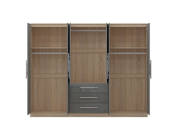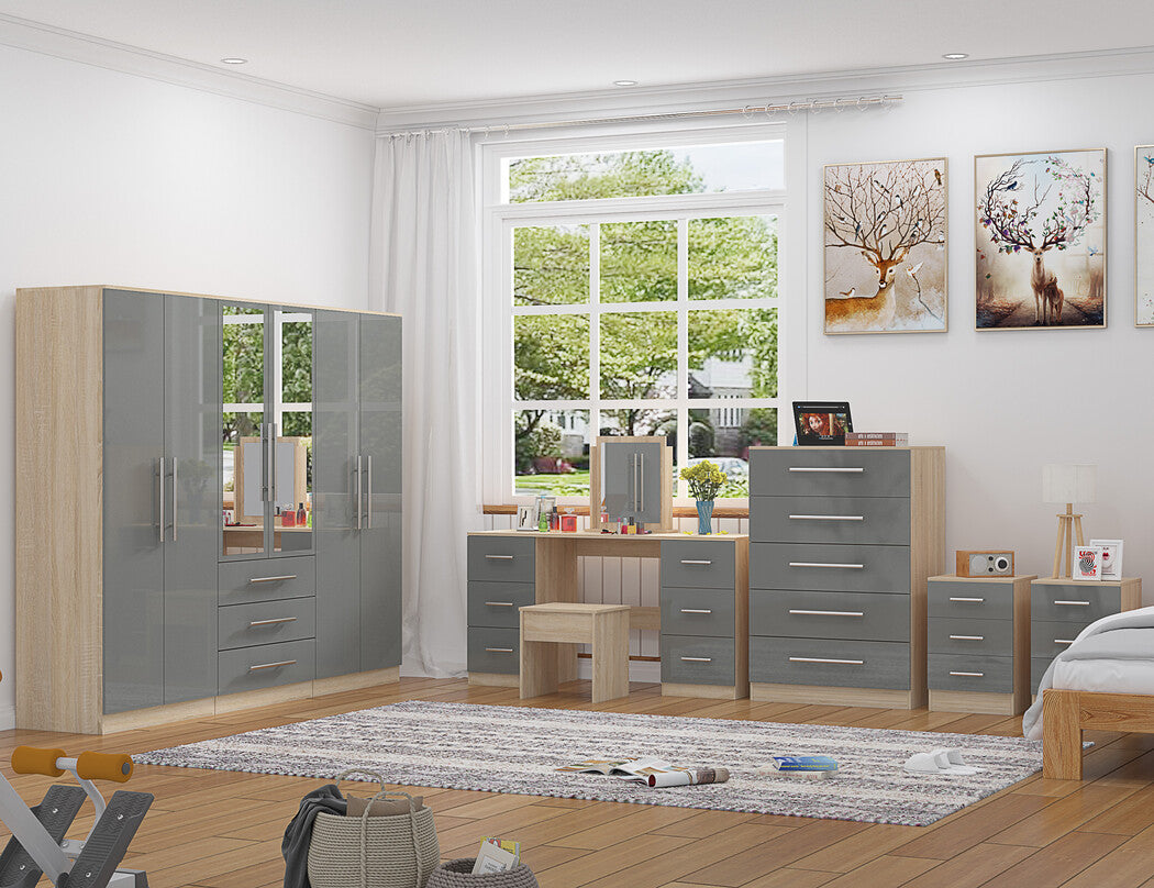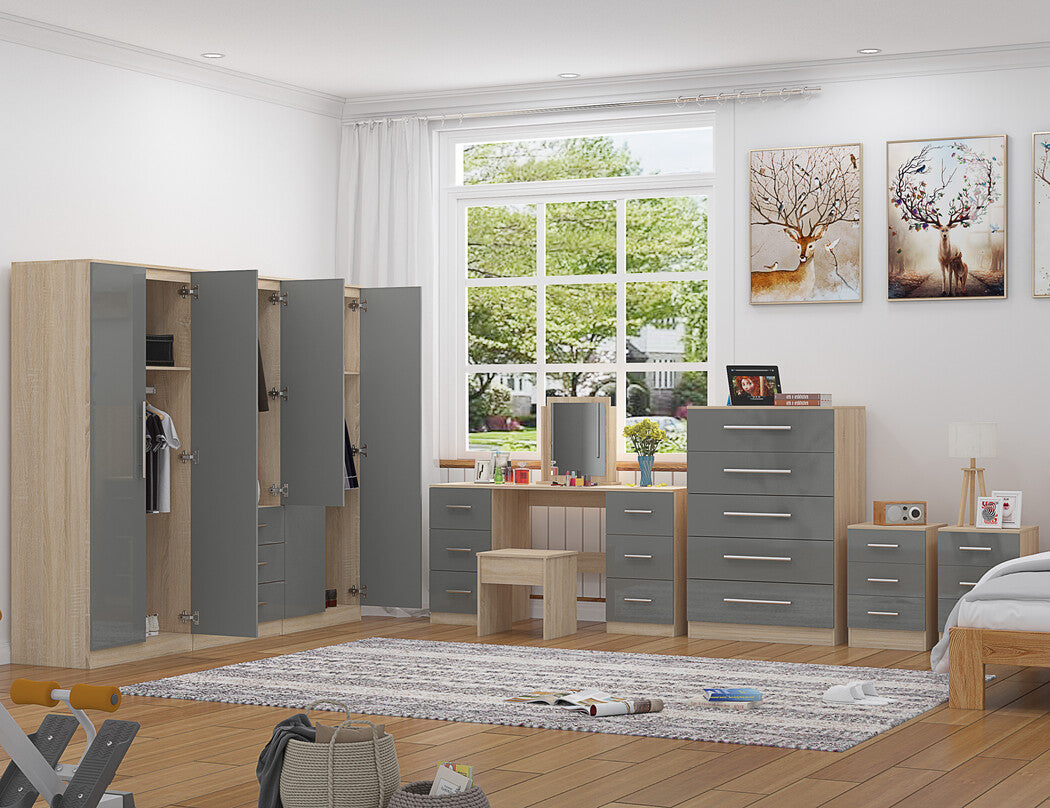 High Gloss Grey, 6 Door Wardrobe + Double Dresser + Chest + 2 Bedsides Unique Furnishings Offers High Gloss Grey,... Read more