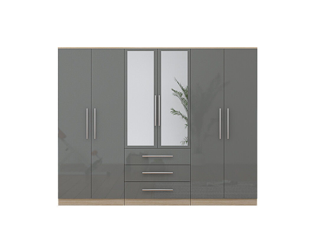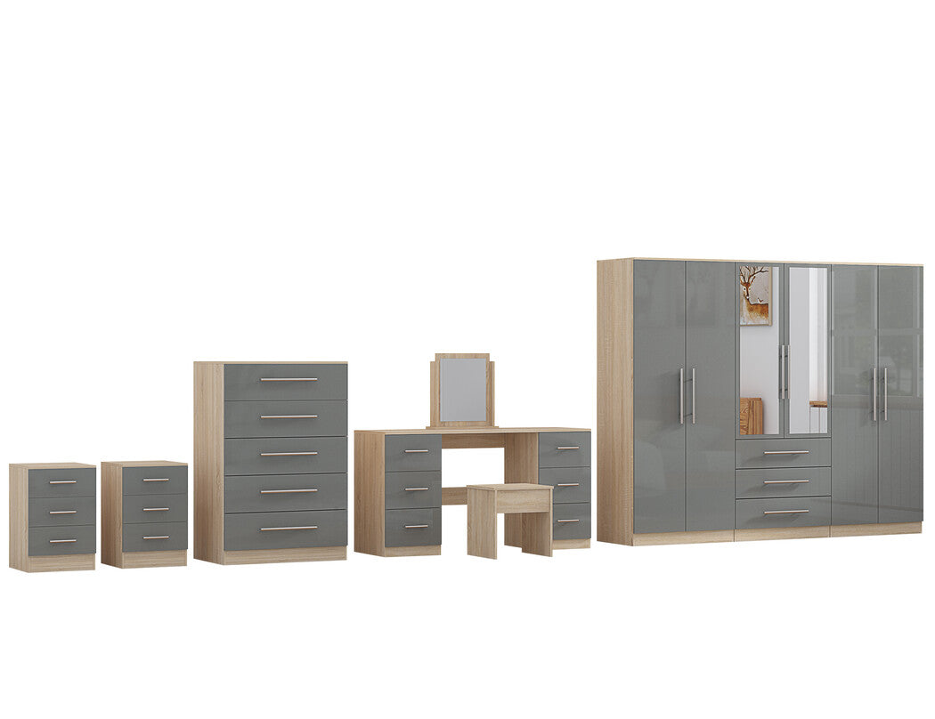 High Gloss Grey, 6 Door Wardrobe + Double Dresser + Chest + 2 Bedsides