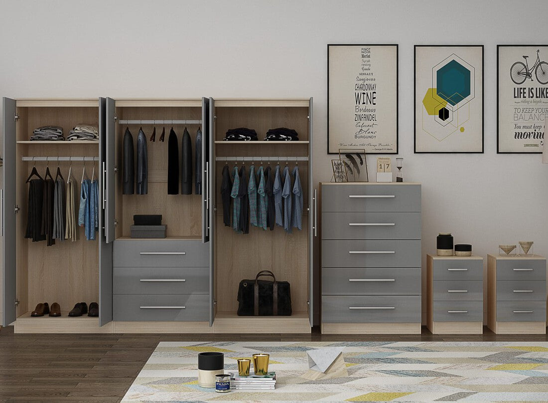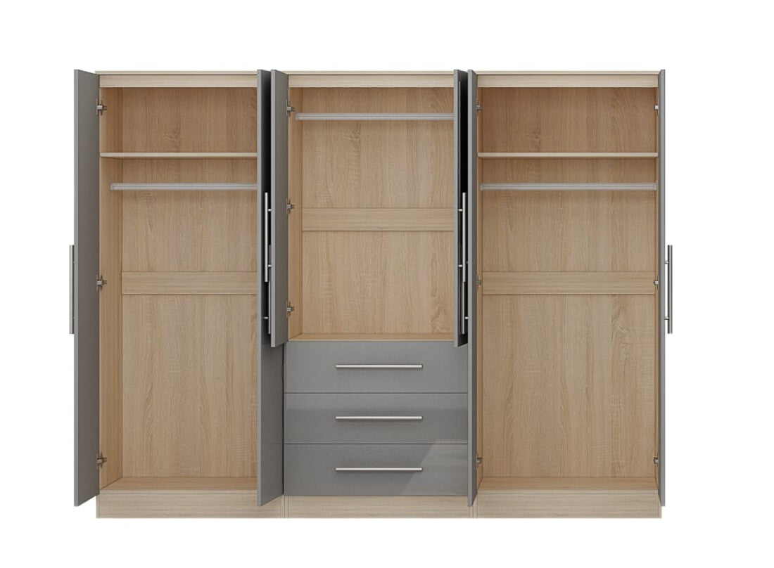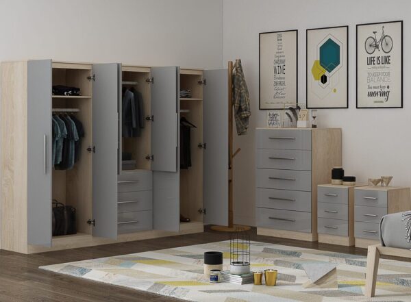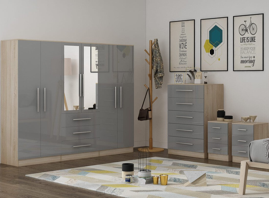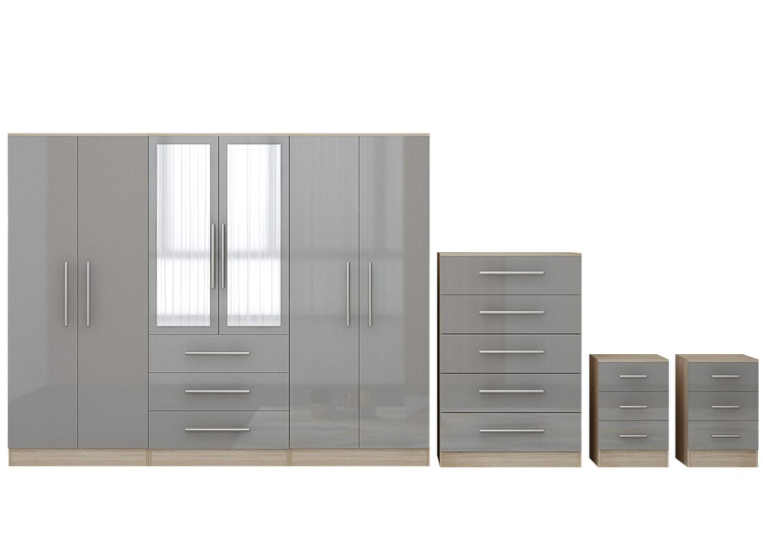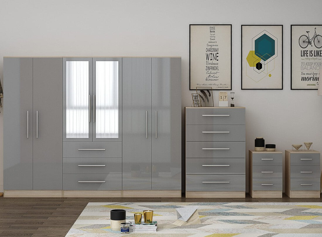 High Gloss Grey Large Wardrobe – 6 Door 3 Drawers & Long Mirror + Chest Of Drawers + 2 x Bedsides