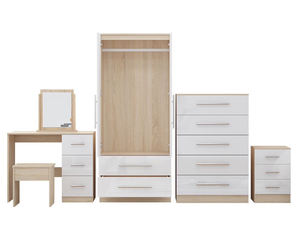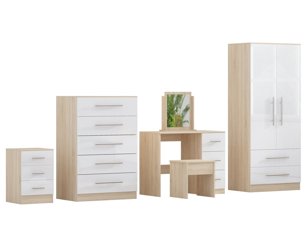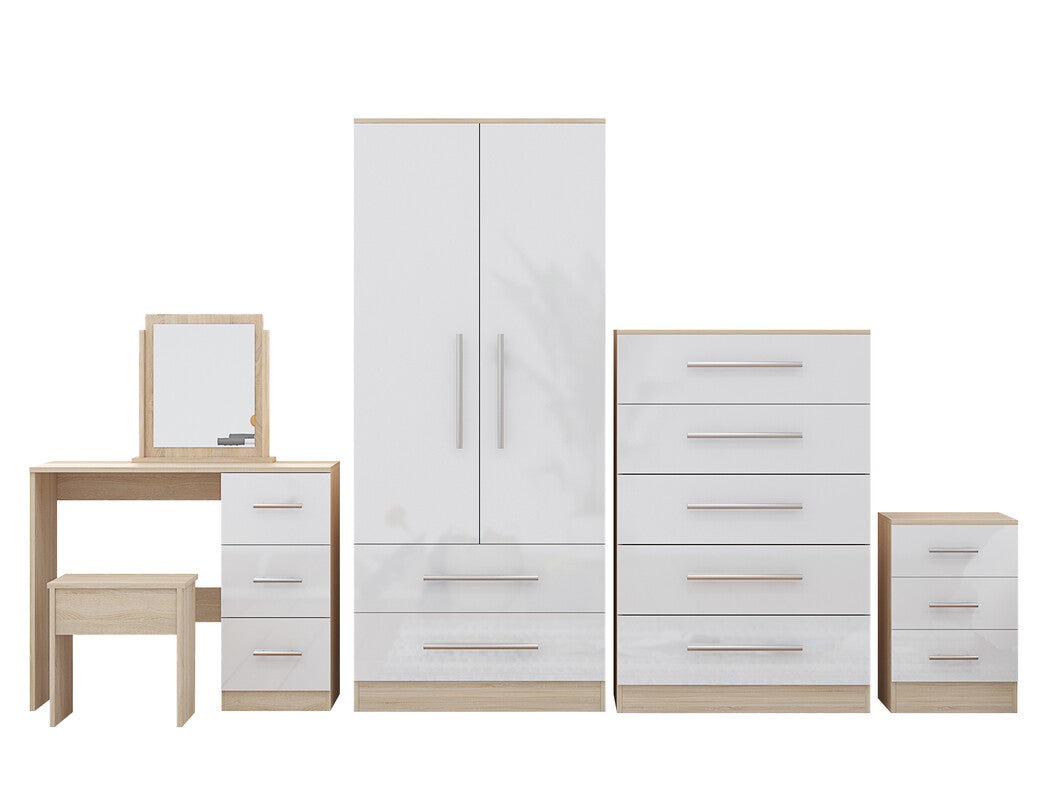 A Quattro threat set of stylish products from the Unique Furniture line, including our 2 Door High Gloss Fitment Wardrobe, a matching High Gloss Chester draweR,a High Gloss Bedside Tables and a dressing table. Very easy to assemble with clear instructions. Made from high quality Chipboard Wood and High Gloss.