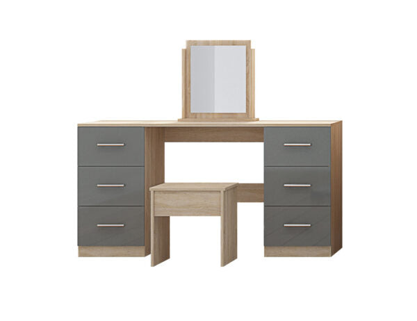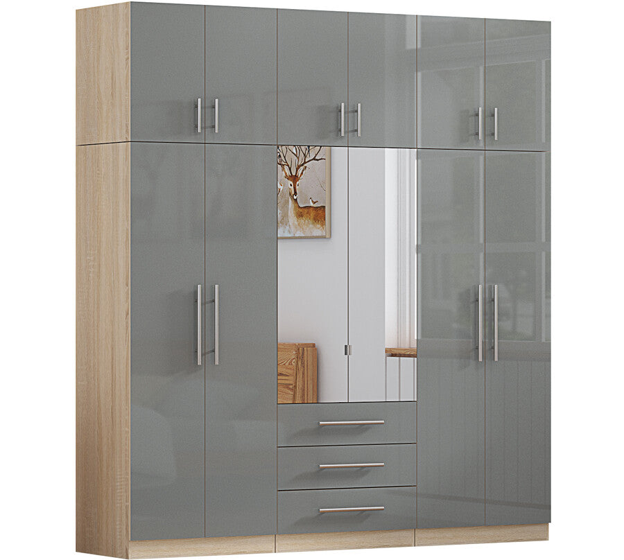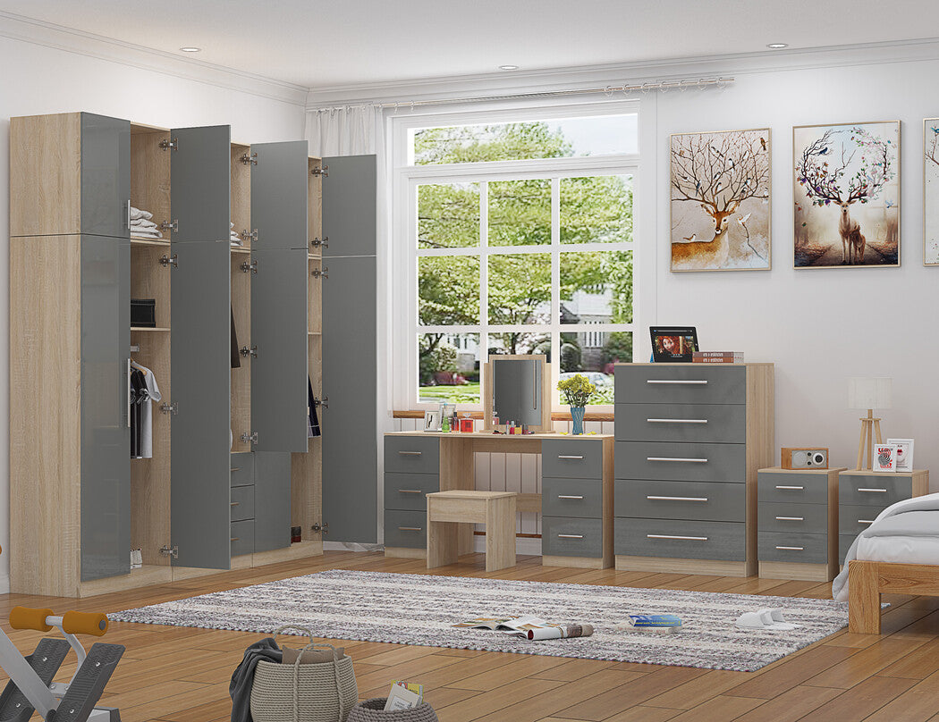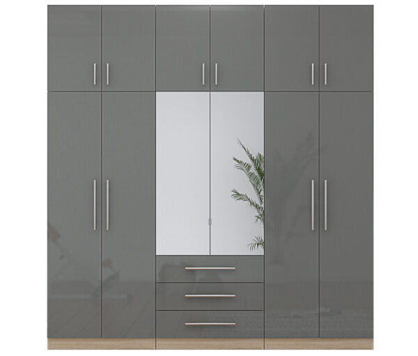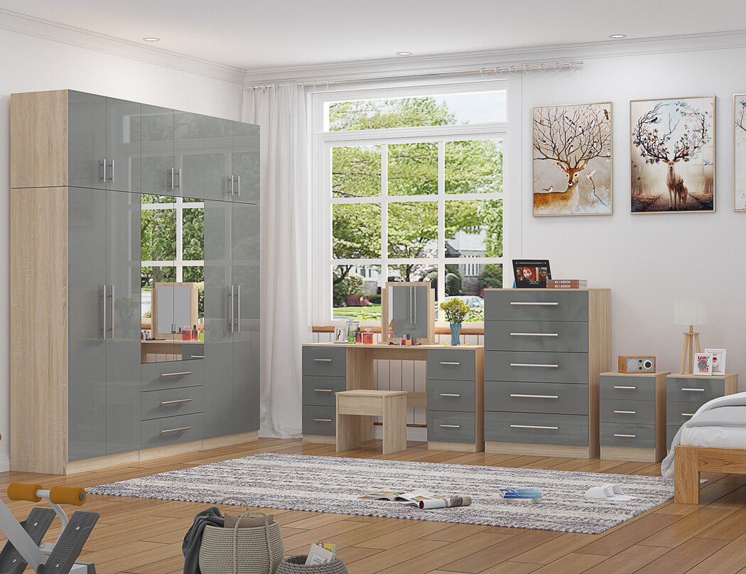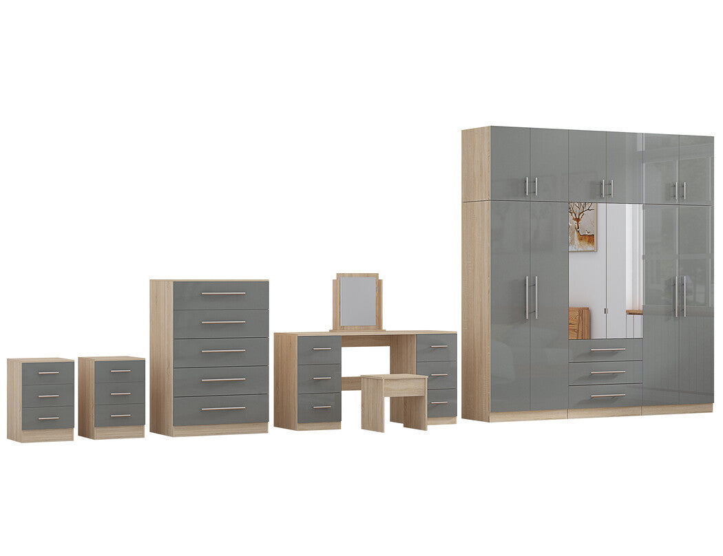 High Gloss Topbox 6 Door Light Grey Mirrored Fitment Wardrobe + Double Dresser + Chest + 2 Bedsides Unique Furnishings... Read more