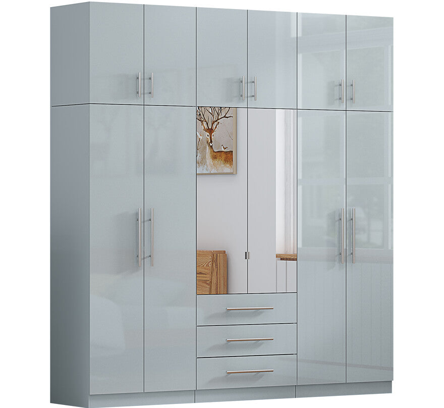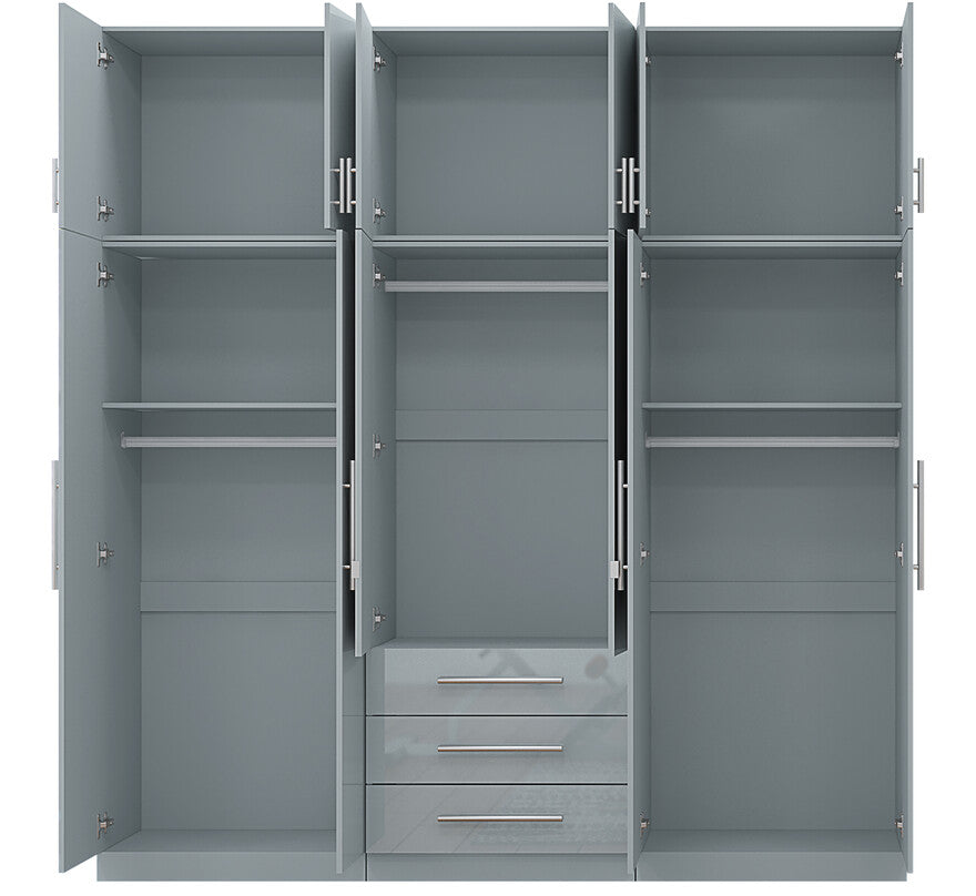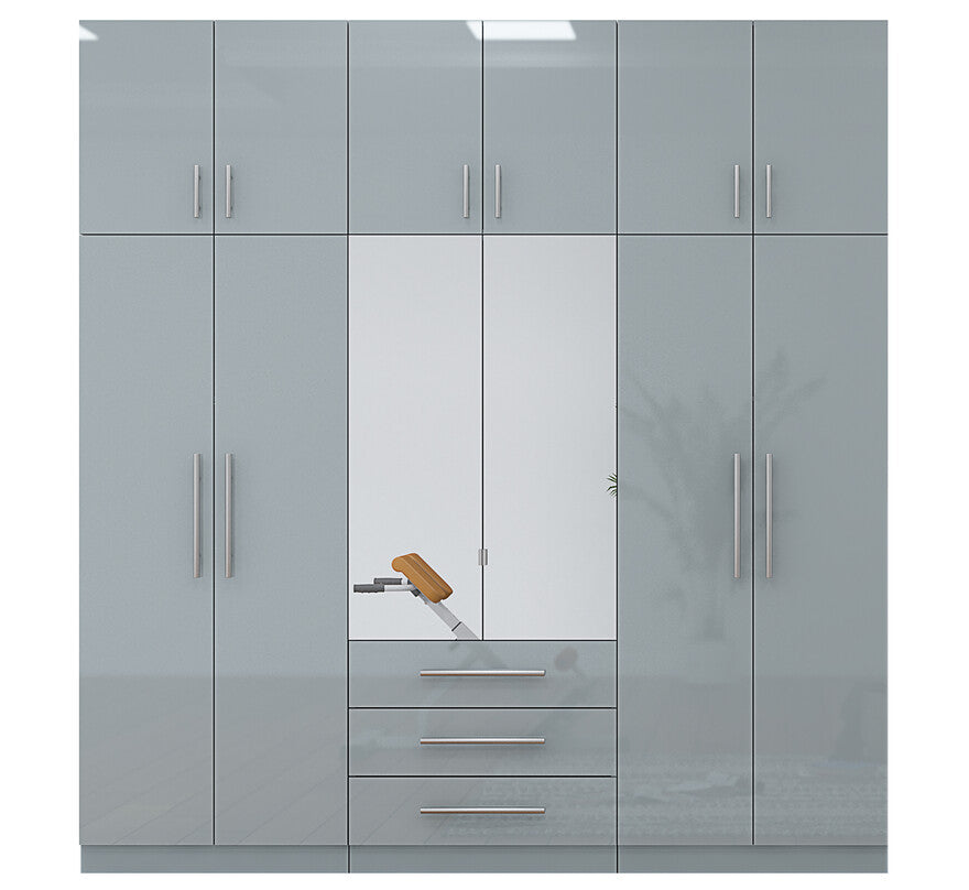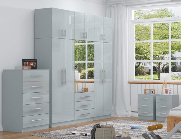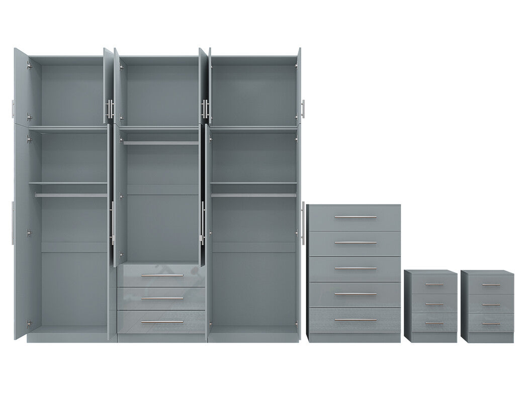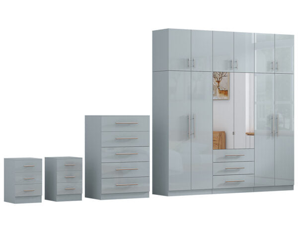 High Gloss Grey Topbox 6 Door Mirrored Fitment Wardrobe + Chest Of Drawers + 2 x Bedsides